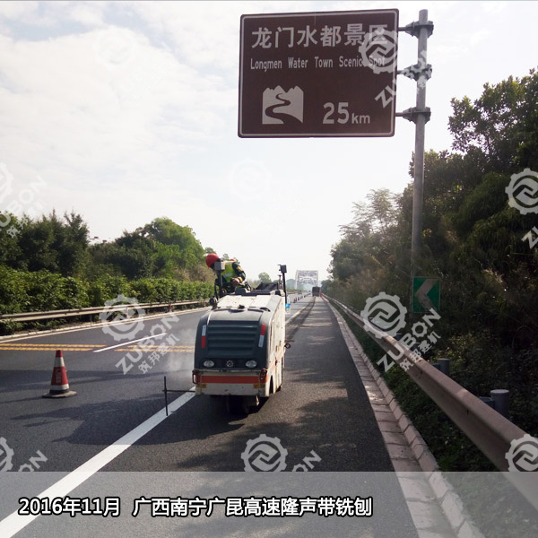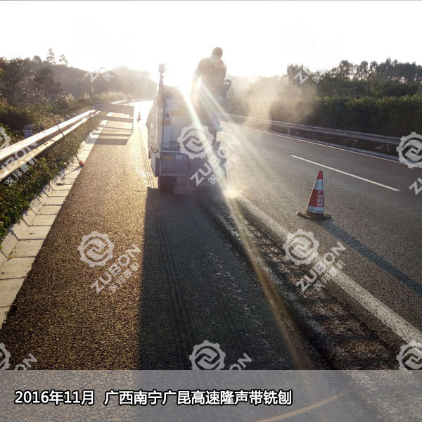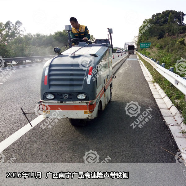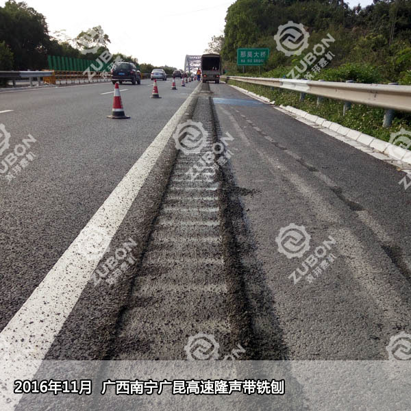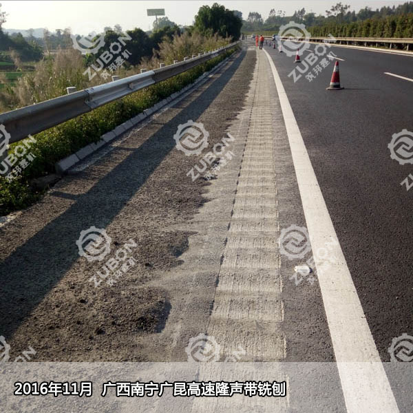 2,凹槽狀的隆聲帶是由半米小型銑刨機施工的,一般的規(guī)格是150*400mm,凹槽深為13mm,截面為圓弧狀。凹槽狀的隆聲帶克服了凸塊隆聲帶的弊端,而且因為深度較淺,積水和積塵很容易被車輪的氣流帶走,而且連續(xù)高密度的凹槽寬度達到40公分以上,在制造輪胎噪音的同時也保證了車胎的抓地摩擦力,確保了行車安全。