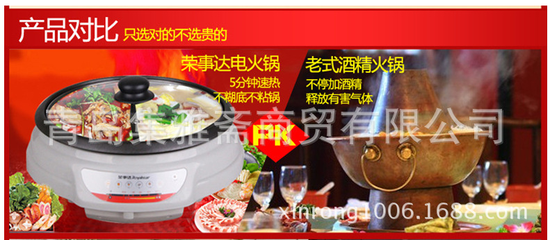 輕松涮火鍋,快樂更出眾;一機兩鍋,解決不同人的口味;一機多能:涮火鍋、制美食,煎、炸、煮、燉、炒豐富餐桌內(nèi)容,調(diào)節(jié)家人不同美食愛好;超大發(fā)熱金屬盤,功率強勁,火力十足,升溫快速,散熱緩慢,有效保溫,降低能耗,節(jié)省電量,節(jié)能型產(chǎn)品;內(nèi)鍋容積大,美食用量多,不粘內(nèi)膽耐磨噴釉,清洗徹底;底部散熱保護體系,快速散熱,使用安全更持久;鍋蓋高強度、耐高溫鋼化玻璃,感受全新美食視覺體驗。榮事達小家電全國聯(lián)保,保修一年,讓您買的放心,用的安心。聯(lián)系電話 qq:13,以下報價不含運費和稅費,具體詳情請電話咨詢。