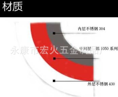 本產品采用高級不銹鋼,304、純鋁、430三層復合鋼材,中間用鋁能大量儲熱,復合鋼一體成型,內外采用不銹鋼,使鍋體耐腐蝕、耐高溫、抗磨耐壓,真正延長壽命。鍋體受熱均勻,快速導熱同時減少油煙。易潔、易刷、不易粘,更節(jié)能。