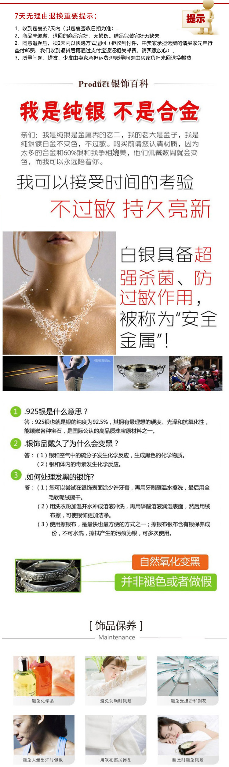 無論是何種材質(zhì)的飾品,MM們在洗澡,睡覺的時候都要取下存放于干燥的地方。純銀是極易變色的金屬,當(dāng)然更應(yīng)如此。