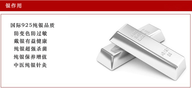 925純銀又稱為“925國際標(biāo)準(zhǔn)銀”。剛剛出土的銀具有銀白色的金屬光澤,長期曝露在空氣中容易產(chǎn)生一層黑色的氧化物,失去表面的光澤,這是銀的氧化現(xiàn)象,但是可以清洗。純銀本身硬度不高,質(zhì)地柔軟,由于化學(xué)反應(yīng)強(qiáng)烈,容易變暗變黑,所以無法以純質(zhì)形式制作成珠寶首飾,而是常與其它金屬和鑄,標(biāo)準(zhǔn)的含量是含銀量在92.5%以上,稱為國際標(biāo)準(zhǔn)銀,硬度比純銀要好,能加工成比較精細(xì)的款式,是防過敏材質(zhì),皮膚敏感者可放心佩戴。