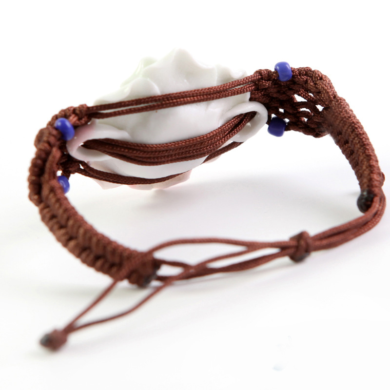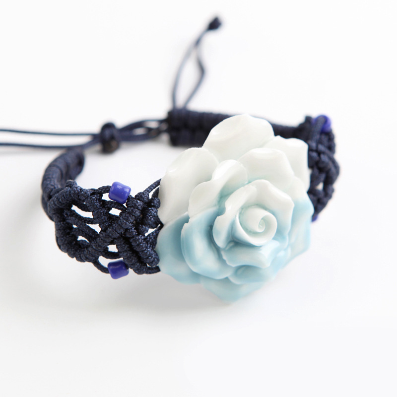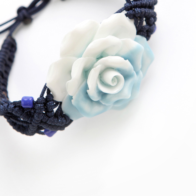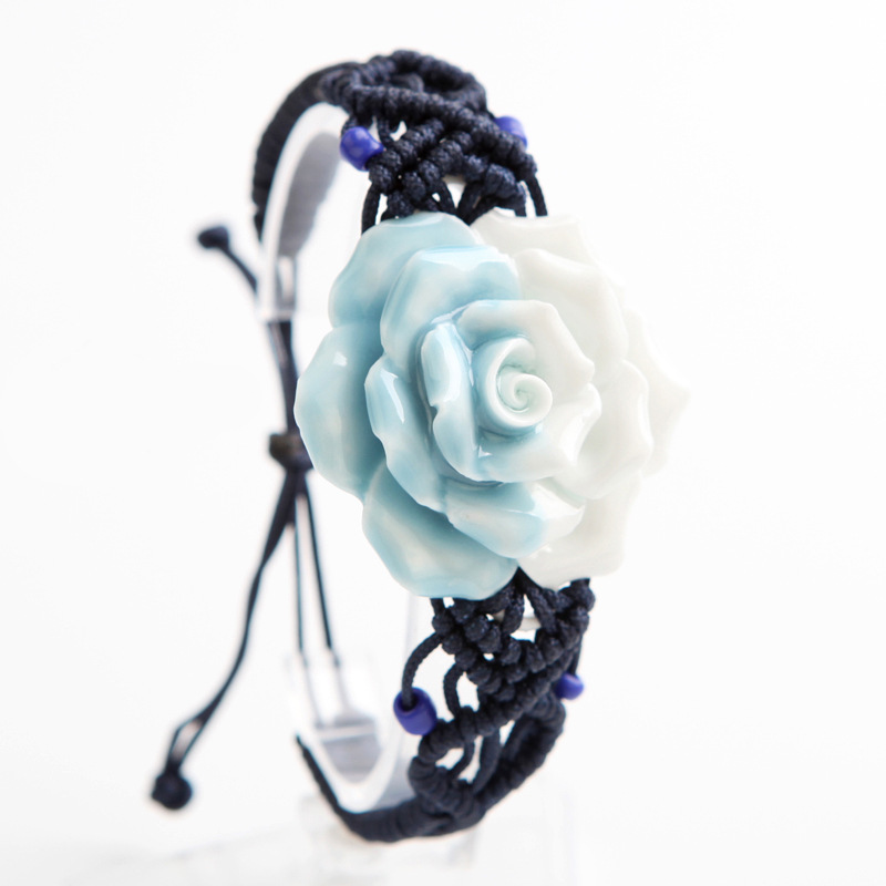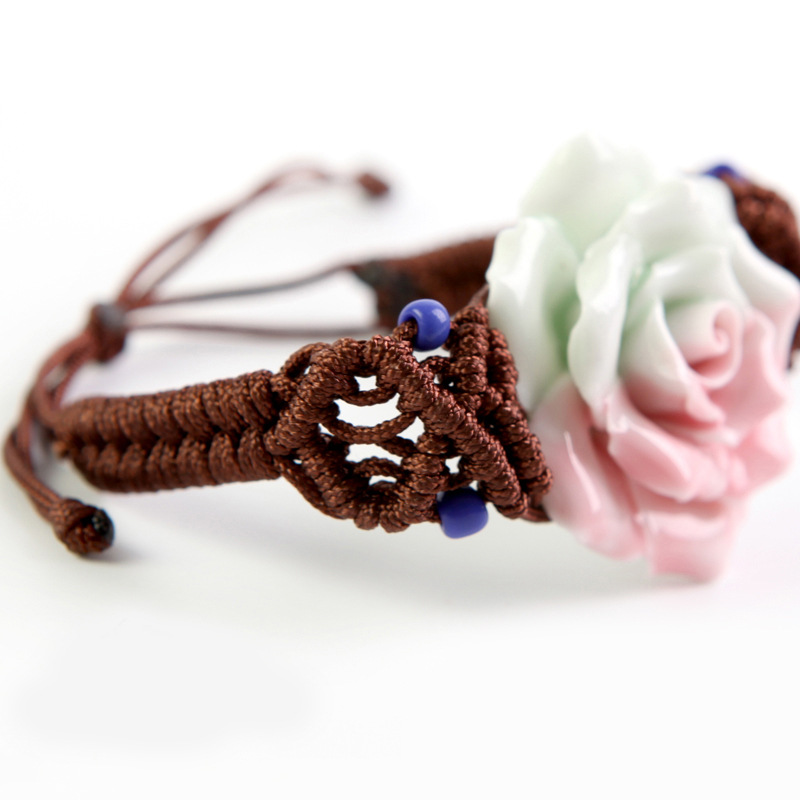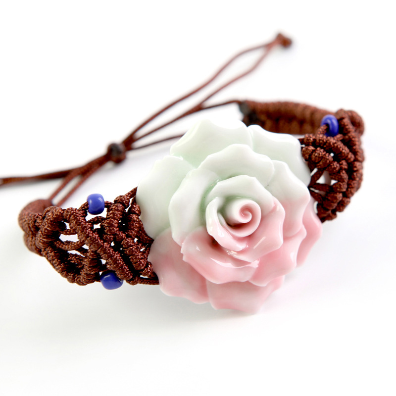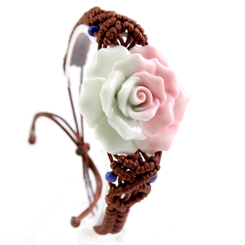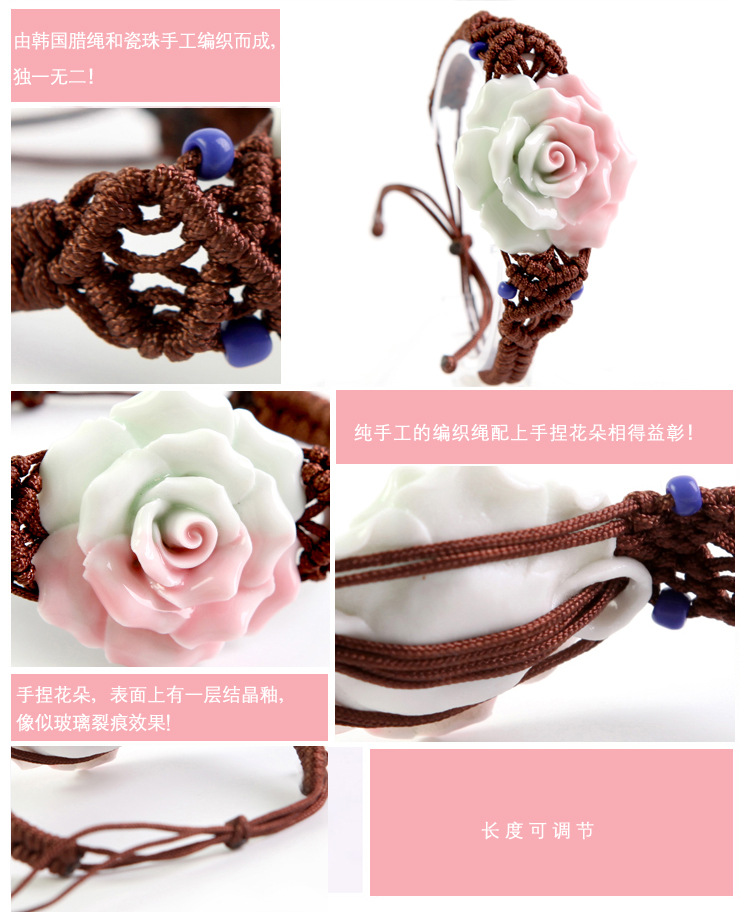 手工捏花手鏈?zhǔn)骤C 陶瓷首飾品 粉月季玫瑰花 女 民族編織