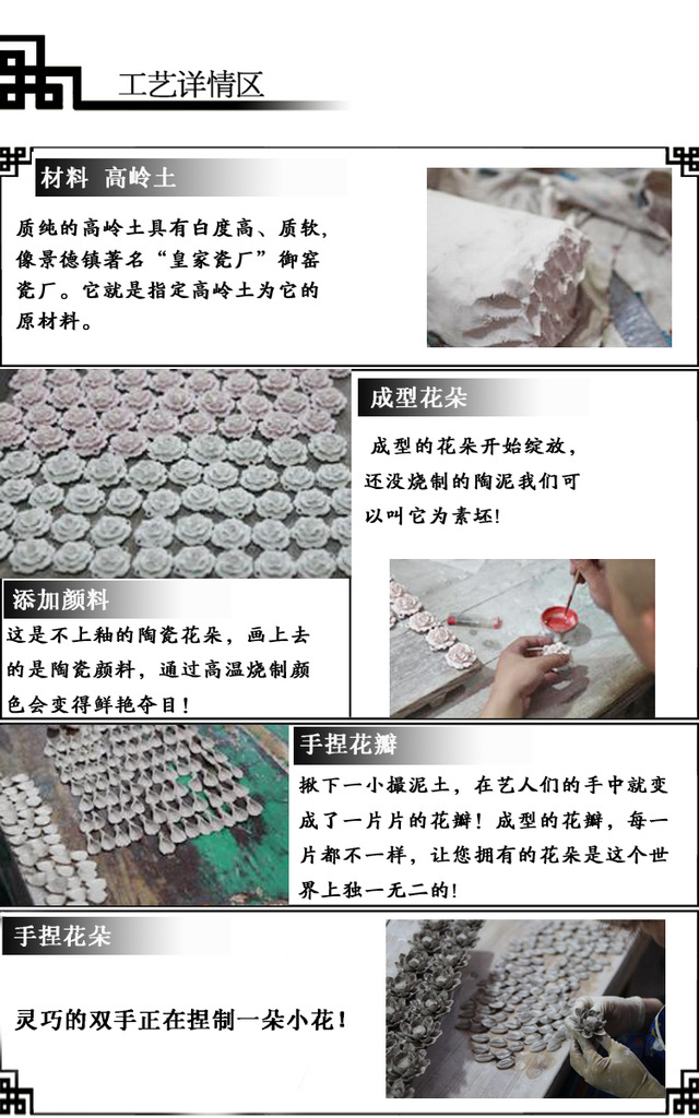 本店的陶瓷首飾均由陶瓷藝人純手工制作,經(jīng)過復(fù)雜的工藝、高溫?zé)裏挾桑抢L畫藝術(shù)、手捏藝術(shù)、雕塑藝術(shù)以及窯火技藝的完美結(jié)合,每一件陶瓷首飾,都是一件精美的陶藝品。