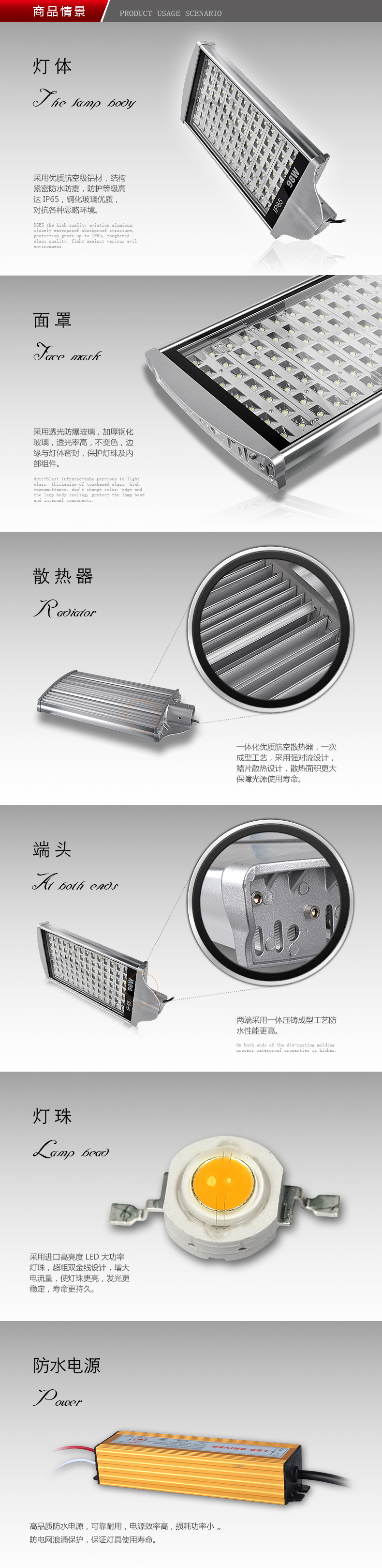 使用鋁壓鑄外殼散熱鰭片和散熱腔的雙重散熱技術(shù),有效降低大功率LED的溫度,另外驅(qū)動(dòng)電源部分與燈具分開安裝,降低了燈體的額外溫升,并使維護(hù)方便。