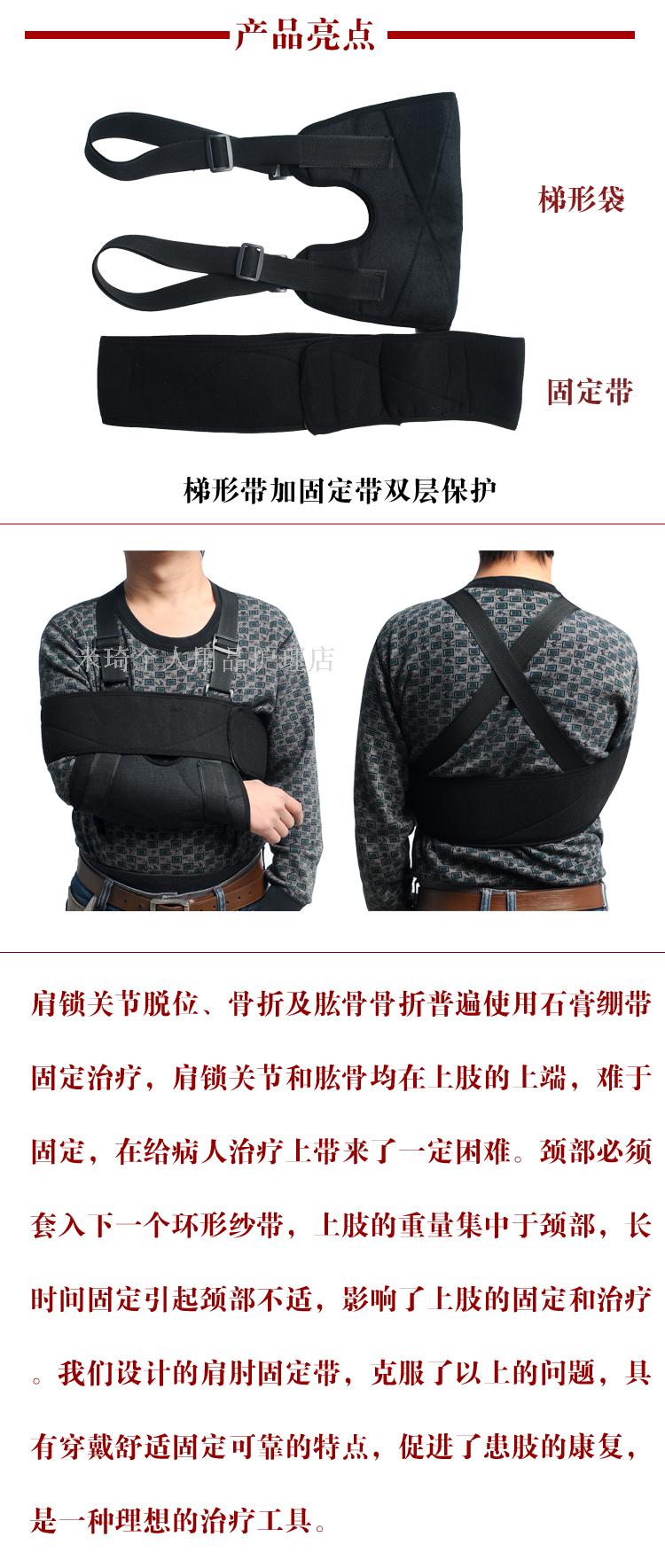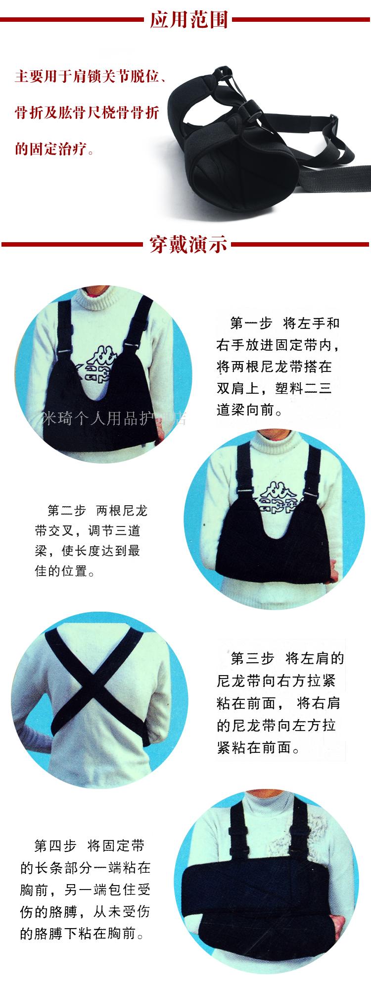 本品由梯形袋和固定帶兩件組成,使用說明如下: 1、將患肢前臂穿入梯形袋,梯形袋上側兩端的背包帶格子通過同側肩膀在背部交差后,分別穿過腋下、梯形袋底部,與梯形袋前面的尼龍袋面布粘連。這樣固定使上肢的重量集中在雙肩上,且梯形袋上背包帶的伸縮可調節(jié)肘關節(jié)角度,使上肢固定在一個舒適的位置。 2、固定帶內(nèi)外二層,外層由尼龍粘帶與布構成。內(nèi)層由全棉絨布制成。內(nèi)層兩端縫有尼龍粘帶,先將固定帶一端內(nèi)層粘帶粘在梯形袋錢,然后把固定帶沿患肢、胸背部從雙側腋下繞一圈,重疊在固定帶上,將另一側內(nèi)層粘帶粘在固定帶外層尼龍袋布上,使患肢牢固固定。 3、肩肘固定帶必須在醫(yī)師指導下使用。 4、使用本品時,若患肢出現(xiàn)腫脹,疼痛加重、麻木,應立即去醫(yī)院咨詢。 5、使用本品時,未遵醫(yī)囑,不可隨意除去。 6、本品不可熱水洗滌,不可曝曬。 7、本品必須存放在干燥通風處。