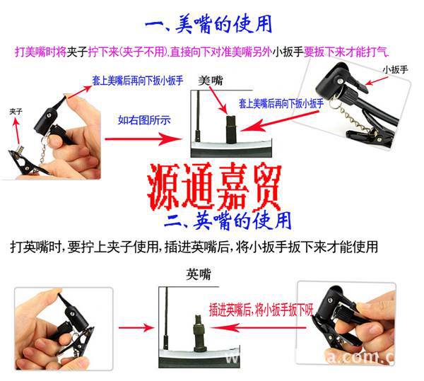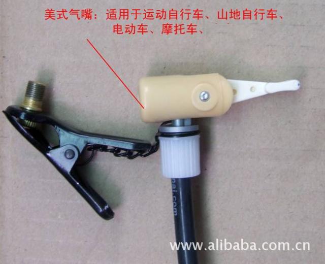 英式氣門:傳統(tǒng)的自行車基本都是這個(gè)類型的氣門,給這種類型的車子打氣時(shí),只要把氣筒前端的金屬接口直接接在車子的氣嘴上,夾好氣筒前端的金屬夾子,按下(壓緊)尾部的手柄(壓緊后,手柄應(yīng)該和前面的塑料氣嘴成90度的直角),就可以直接打氣了。