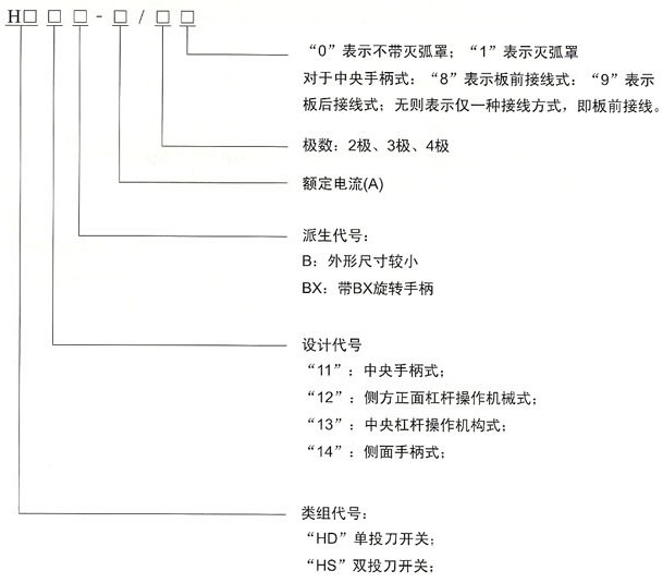 HD系列、HS系列單投和雙投刀開關(guān)適用于交流50Hz,額定電壓380V,直流至230V,額定電流至1500A(非標(biāo)產(chǎn)品可至4000A)的成套配電裝置中,作為不頻繁地手動(dòng)接通和分?jǐn)嘟?、直流電路或作隔離開關(guān)用。其中: