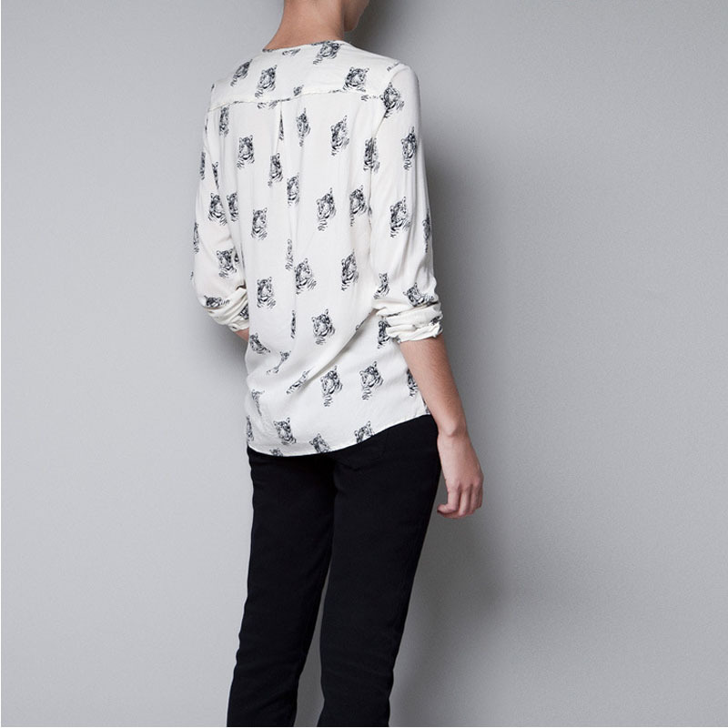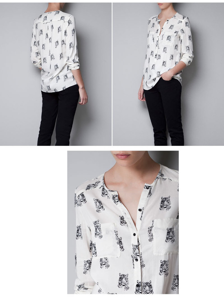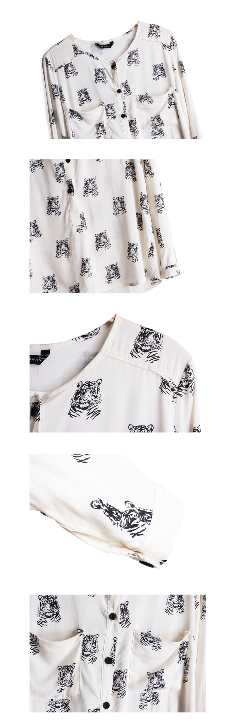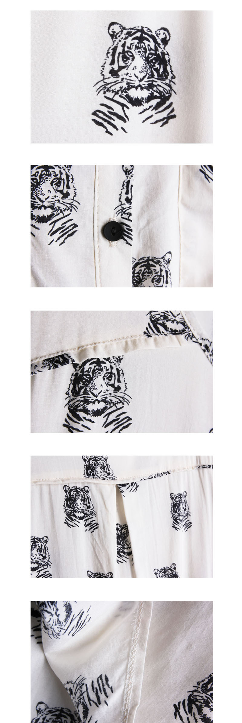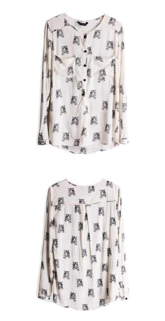 老虎頭印花V領(lǐng)設(shè)計(jì)、長(zhǎng)袖、袖子可挽起、穿著方便隨意、
