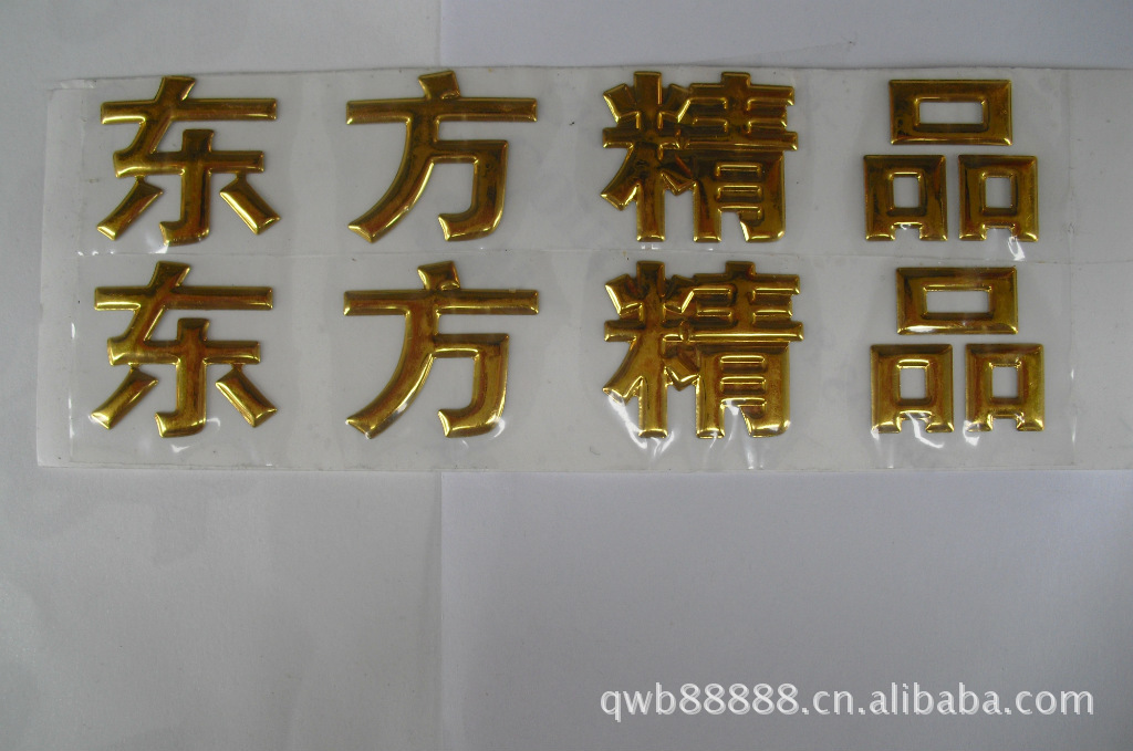 三維軟標,規(guī)格、大小、厚度、顏色均按客戶要求,客戶只要提供一份標準的圖稿,我公司即可開模、打樣、生產(chǎn).這種標牌有明顯的立體感,克服了其它平面的標牌的不足.且柔韌性強,很不易折斷.表面覆透明保護膜,背面刷膠水,使用非常方便.可做金色、銀色、黑色、紅色等多種顏色,且長期不會變色