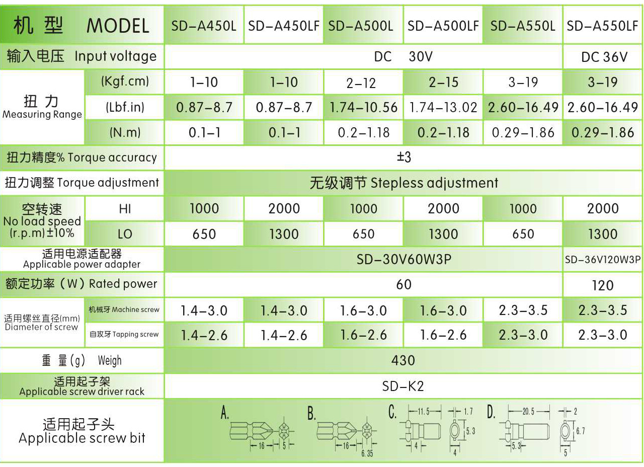 •全自動(dòng)電動(dòng)螺絲刀,當(dāng)螺絲鎖緊達(dá)到設(shè)定扭力時(shí),離合器會(huì)自動(dòng)跳脫,馬達(dá)會(huì)自動(dòng)斷電并及時(shí)剎車,讓電動(dòng)螺絲刀停止運(yùn)轉(zhuǎn)。•無(wú)碳刷電機(jī),扭力輸出更加穩(wěn)定,適合在無(wú)塵作業(yè)環(huán)境使用,穩(wěn)定性高,操作簡(jiǎn)單,起子可以長(zhǎng)時(shí)間使用。•采用無(wú)觸點(diǎn)開(kāi)關(guān),不需要更換易耗品,超長(zhǎng)使用壽命。•操作簡(jiǎn)單,扭力穩(wěn)定,提高工作效率,馬達(dá)長(zhǎng)時(shí)間使用不疲乏,適合在流水線工作中使用。•扭力調(diào)整由扭力調(diào)整環(huán)左右旋轉(zhuǎn)無(wú)級(jí)調(diào)節(jié),轉(zhuǎn)速可分Hi/Lo開(kāi)關(guān)兩段調(diào)節(jié)。•體質(zhì)小,重量輕,低噪音,采用流線型8991-觀設(shè)計(jì),性能穩(wěn)定,電機(jī)不需要保養(yǎng)與維護(hù),起子可以長(zhǎng)時(shí)間使用。•扭力精度高,采用無(wú)級(jí)式扭力調(diào)整,操作簡(jiǎn)單,適用于一般電子電器產(chǎn)品燈具、小家電、玩具、電腦周邊配件等加工裝配作業(yè)。 技術(shù)參數(shù):
