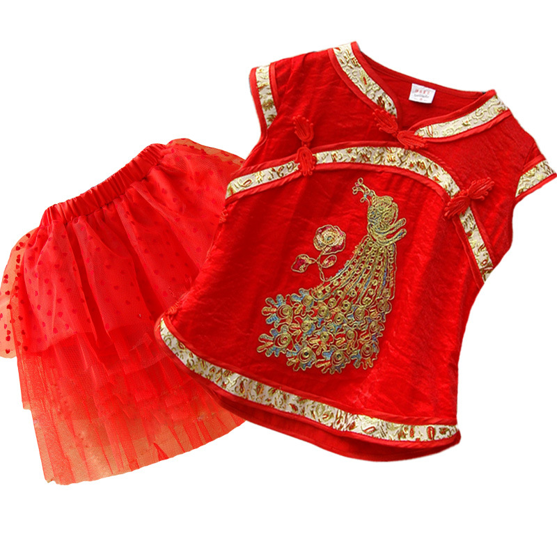廠家直銷新女童夏短袖唐裝禮服紗套裙 兒童舞臺(tái)表演服套裙批發(fā)