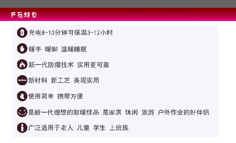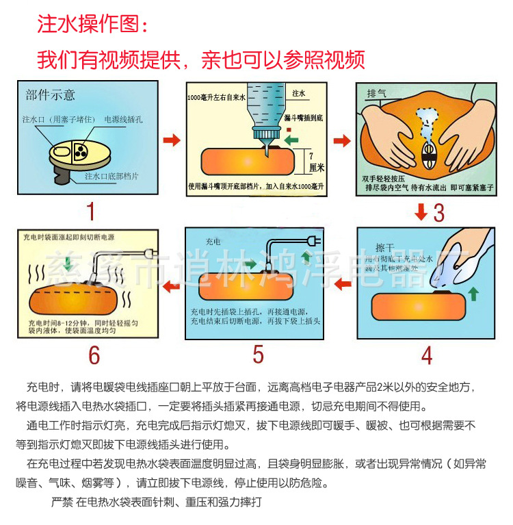 4)通電:劃開電源蓋.將電源線插頭插入電源線插孔上.在接通電源.正常通電8-15分鐘.但以手感舒適度為佳.備注:1.先將電源線插孔插入水袋的插孔上再接通電源.2.充電結(jié)束后應(yīng)先拔去外接電源.再分離電源線插頭與水袋.
