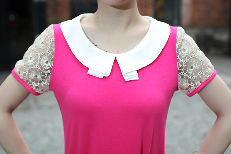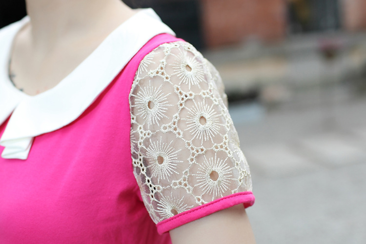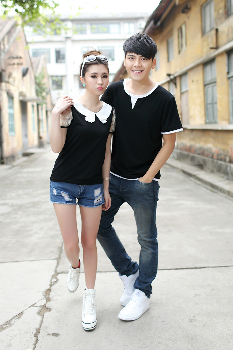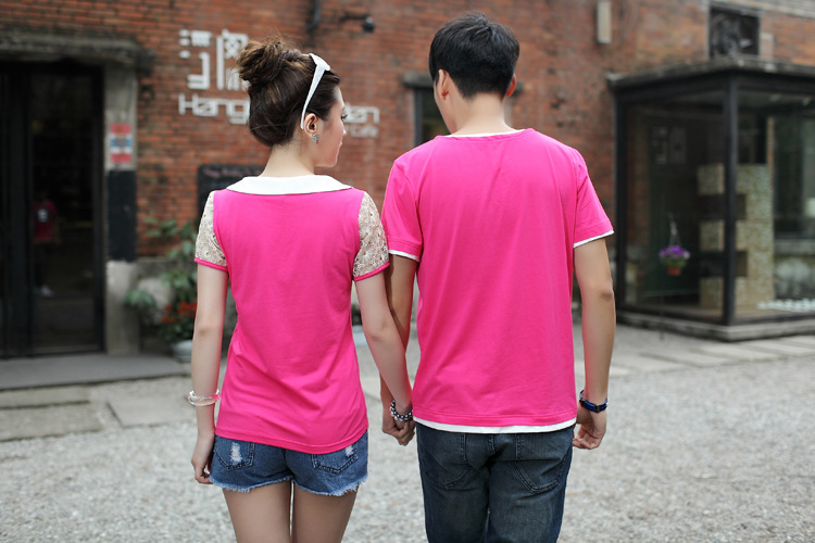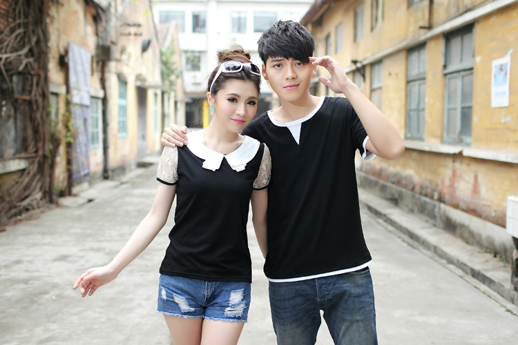 9221#(實(shí)拍)情侶裝夏裝 2015新款韓版娃娃領(lǐng)蕾絲夏季短袖T恤女