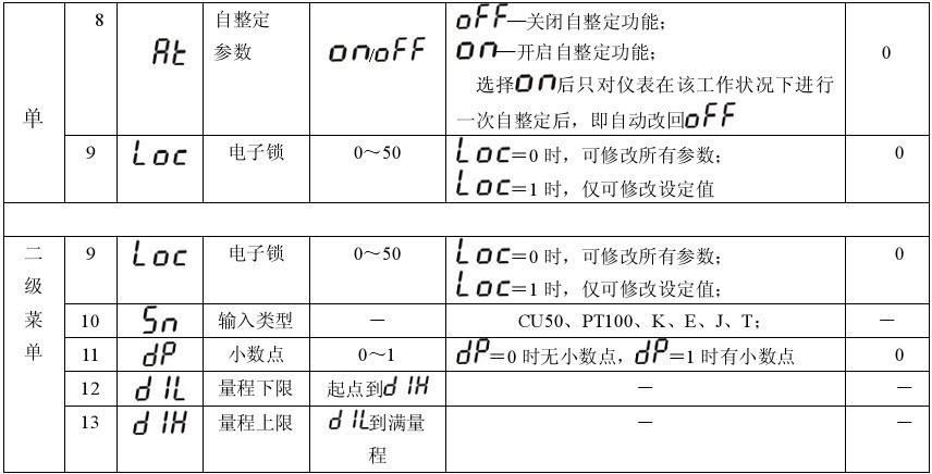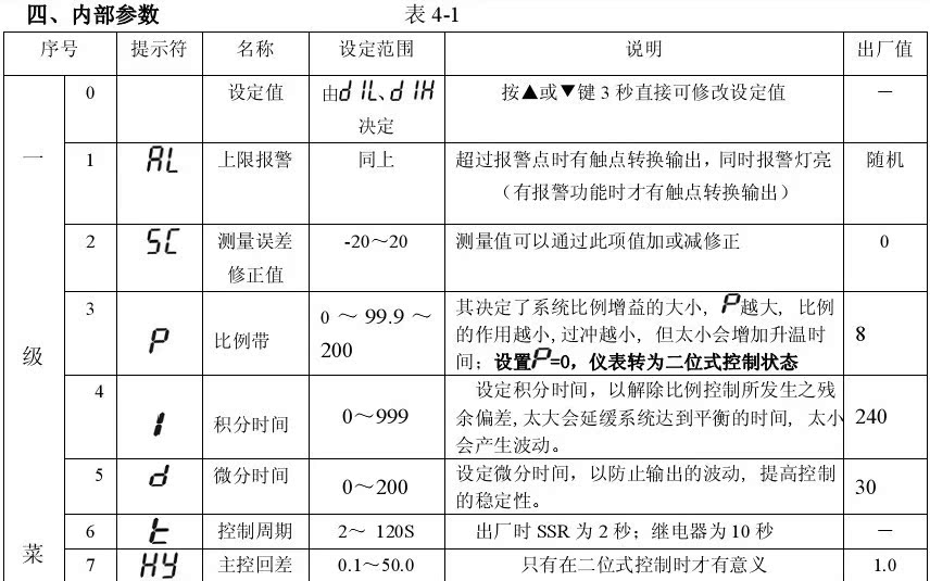 按SET鍵 3秒進入一級菜單,顯示窗交替顯示參數(shù)符號和參數(shù)值,按▲鍵或▼鍵修改,長按鍵可實現(xiàn)快速加或減。修改完成后,按SET鍵保存進入下一參數(shù)設(shè)置。不按任何鍵,10秒后自動保存退出。