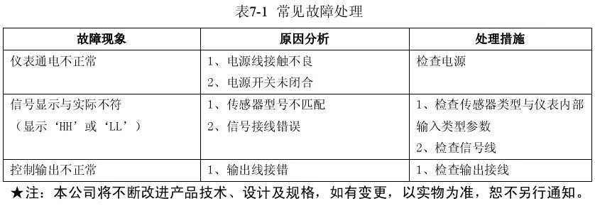 故障一般是操作或參數(shù)設(shè)置不當(dāng)引起的。若發(fā)現(xiàn)無法處理的故障,請記錄故障現(xiàn)象并及時通知當(dāng)?shù)卮砩?br />或者與我們聯(lián)系。表7-1是XMT*308儀表在日常應(yīng)用中的幾個常見故障: