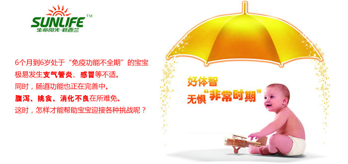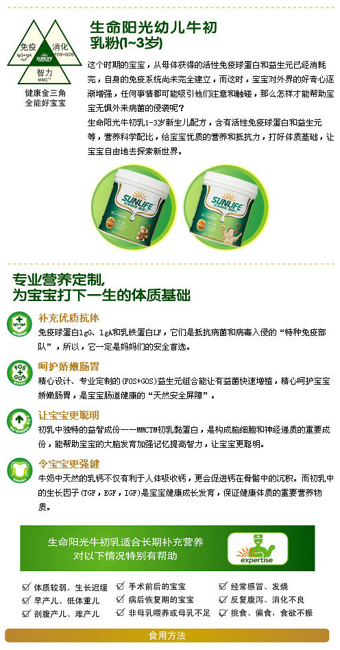 生命陽光嬰幼兒牛初乳配比活性免疫球蛋白加優(yōu)質(zhì)天然益生元,針對0~1歲、1~3歲、3歲以上不同階段嬰幼兒健康之需求量身定制,以特殊營養(yǎng)解決寶寶的健康問題!