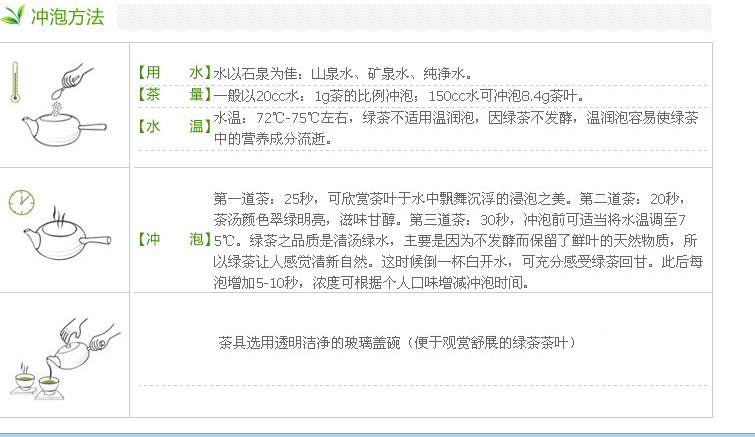一、辮“色綠”:茶葉的“色綠”主要由茶葉本身和炒制水平所決定,一般雨前龍井茶葉為一芽或一葉一芽的,茶葉質量應該比較上乘,加上手工炒制或成熟的機械工藝加工,這時龍井茶的色澤在翠綠和龍井茶農謂之的“糙米色”相間,而且綠、黃兩色天然渾成。但市場上有大量因炒制不當而造成的硬黃綠色,但這是加大火候硬“悶”出來的,黃得死翹翹、糊糟糟,通體蒙一層陰黃若浮腫病臉色,乃至隱約炒焦痕跡。