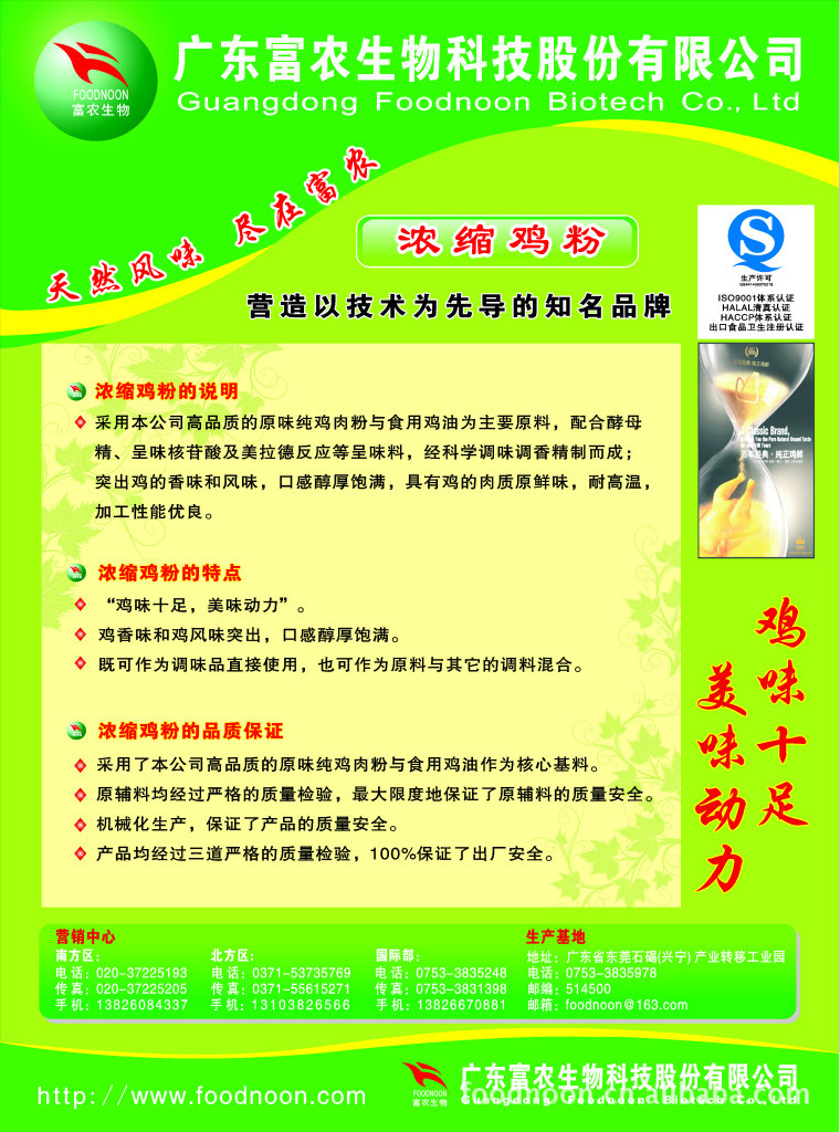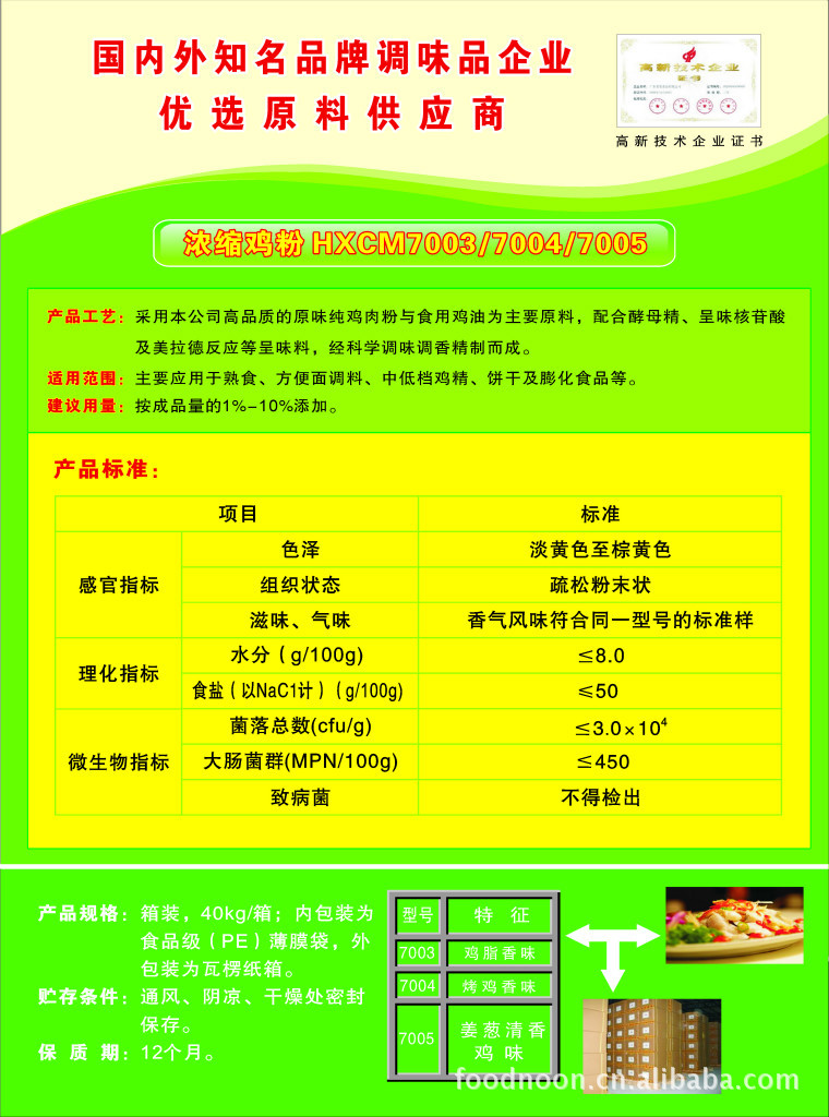 產品特點:采用山地放養(yǎng)雞經科學熬煮、水相抽提、真空濃縮、噴霧干燥精制而成,保留雞的原汁原味香原色,肉香型,純正濃郁的煮雞風味,蛋白質≥40%。