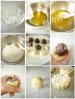 面粉160克,植物油40克,轉(zhuǎn)化糖漿(或golden syrup) 110~120克,堿水1/2小匙 (可用小蘇打(bakeing soda)1/2小匙 水1小匙代替),鹽少許,月餅餡(大月餅需要880克,小月餅需要600克),咸蛋黃(大月餅需要8個,小月餅需要10個),酒(米酒或高梁酒或rum都行) 2大匙,裝飾(蛋黃2個,水或corn sryup或植物油 2小匙,攪拌均勻)。