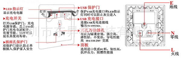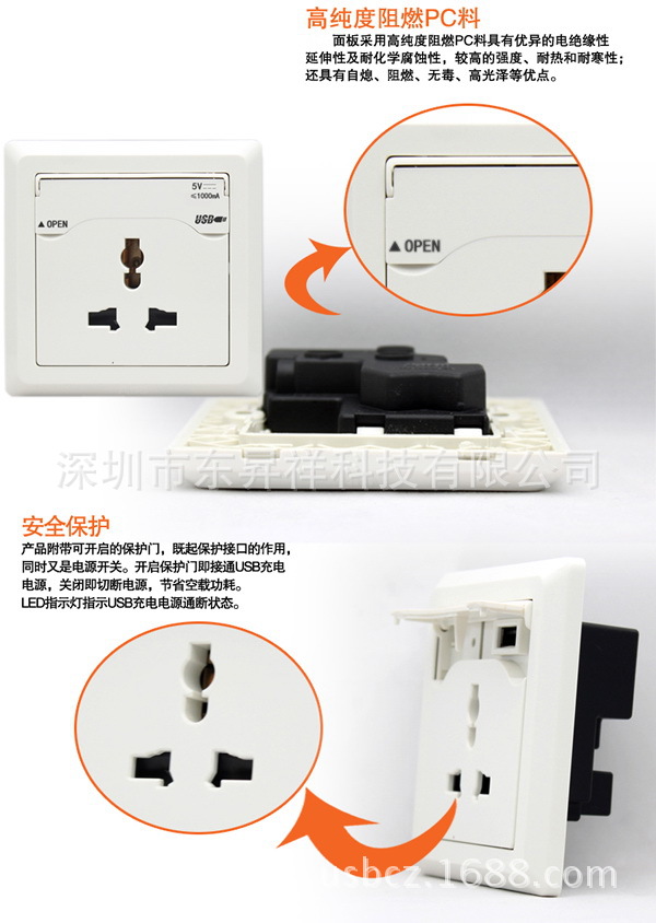 5,可開啟的USB保護(hù)門,既起保護(hù)USB接口的作用,同時又是USB電源開關(guān)。開啟保護(hù)門即接通USB充電電源,關(guān)閉即切斷USB電源,節(jié)省空載功耗。