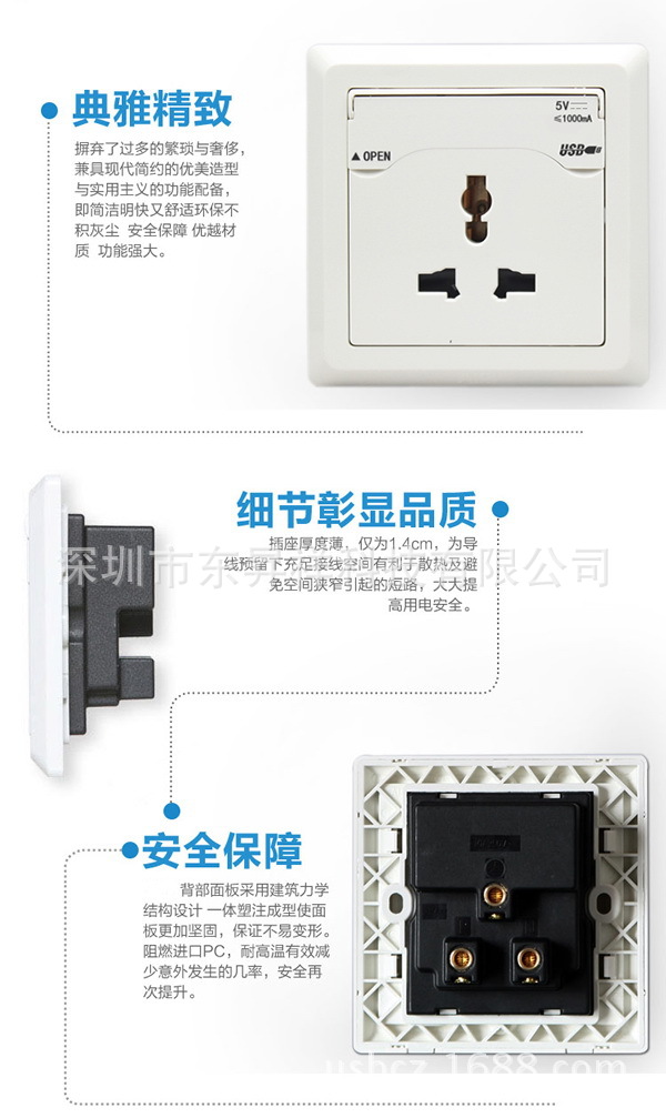 USB充電墻壁插座除了有創(chuàng)意的設(shè)計(jì),還有穩(wěn)定優(yōu)異的質(zhì)量,能應(yīng)用在各種公、私場合,辦公樓、酒店、別墅、公寓和普通家居均可采用。USB充電墻壁插座的安裝簡單,與普通插座安裝方式相同,都可安裝在墻壁或桌面等位置。