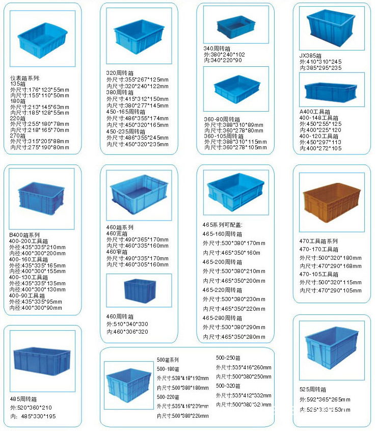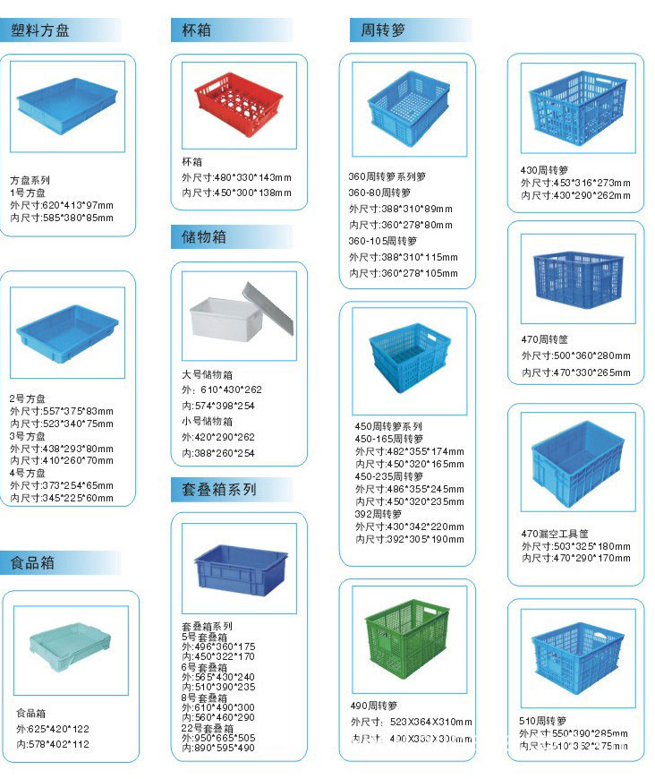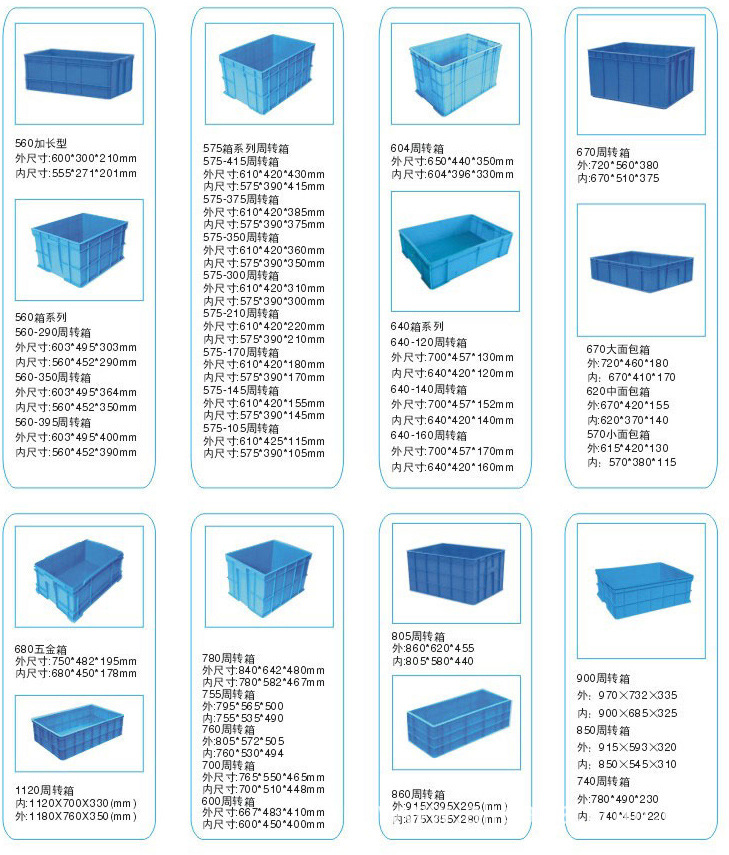 選擇塑料周轉(zhuǎn)箱注意事項(xiàng):塑料周轉(zhuǎn)箱分網(wǎng)眼可疊、網(wǎng)眼可套、封閉可疊、封閉可套四種,適合倉庫、生產(chǎn)流水線、廠區(qū)內(nèi)部周轉(zhuǎn)及運(yùn)輸途中周轉(zhuǎn)使用??莎B型適合堆垛,可套型不適合堆垛,但是可套型在使用完畢后堆垛起來可以節(jié)省空間,節(jié)約運(yùn)輸成本。網(wǎng)眼型只可以存放固體物品,封閉型即可存放固體物品也可以存放液體物品。通用塑料周轉(zhuǎn)箱,由于成型工藝條件關(guān)系,上口會(huì)略大于底部,因此有效內(nèi)尺寸略小于實(shí)際內(nèi)尺寸5~7mm斜插式塑料周轉(zhuǎn)箱,有效內(nèi)尺寸根據(jù)堆放物品不同而異。在生產(chǎn)流水線的輸送帶上推薦使用平底無加強(qiáng)筋的塑料周轉(zhuǎn)箱,另可配有插卡(標(biāo)簽卡、標(biāo)簽袋),也可以配箱蓋,箱蓋通常分平蓋和翻蓋兩種,選用箱蓋后,長(zhǎng)*寬*高會(huì)相應(yīng)增加。