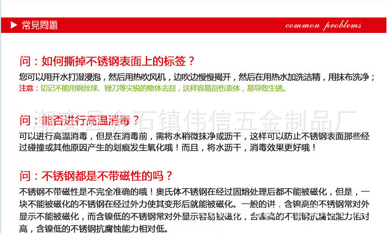■每次使用后,請用海綿或軟布徹底清洗及擦干 、能保持不銹鋼的光潔度和衛(wèi)生。如不徹底清洗,會使不銹鋼表面出現(xiàn)白色的薄膜(水中的礦物質(zhì)及食 物的淀粉質(zhì)),還需要用檸檬汁或白醋進(jìn)行擦洗。
