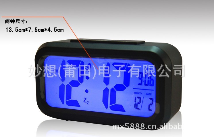 鬧鐘帶光敏傳感器,夜晚無燈光狀態(tài),LED藍色夜燈會微微亮起。