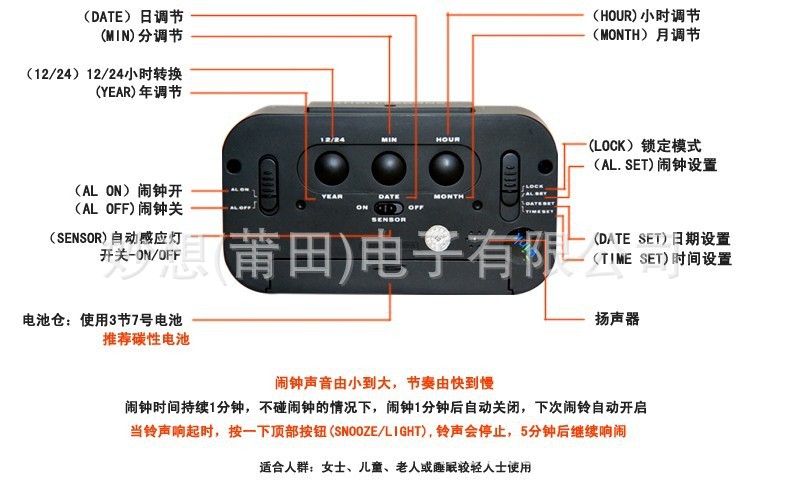 這款鬧鐘功能齊全,鈴聲是BB的漸進鈴聲,響鈴時間持續(xù)一分鐘,鬧鐘響起可按下貪睡鍵暫停5分鐘。
