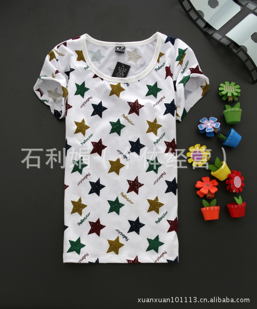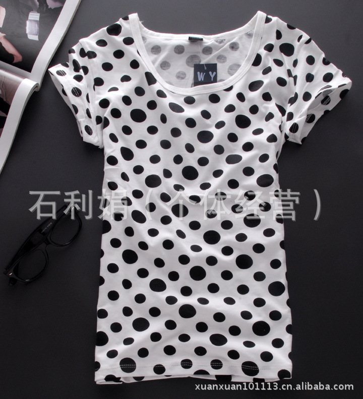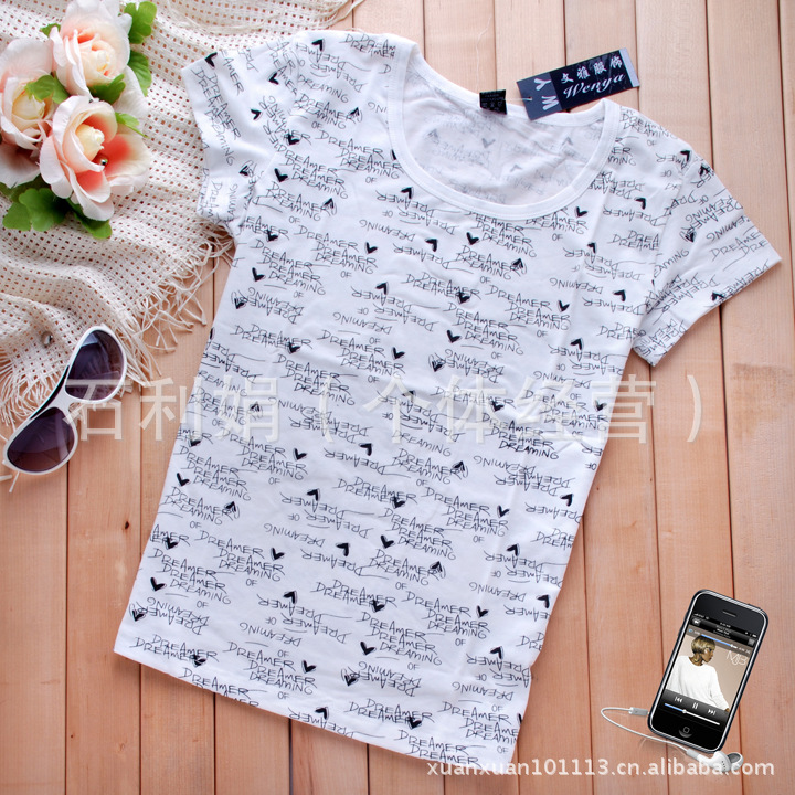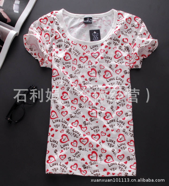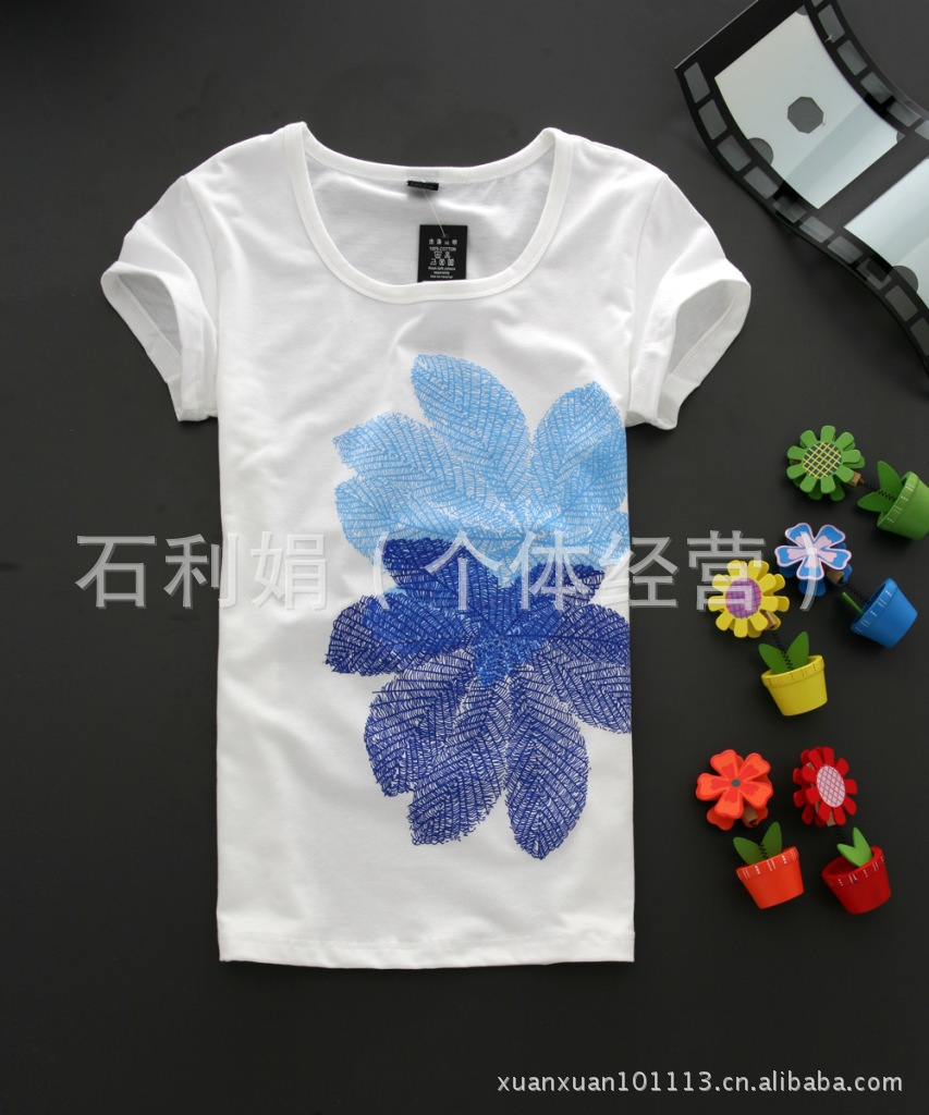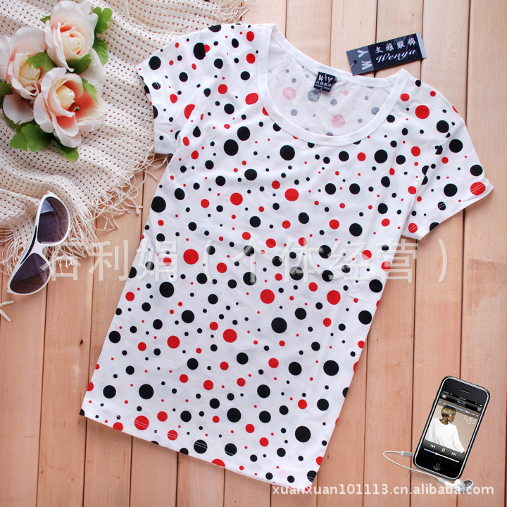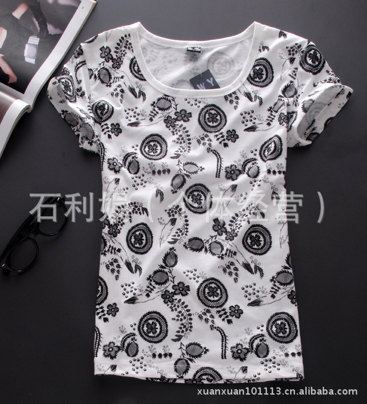 E系列瑞麗時尚女式T恤批發(fā) 女裝短袖T恤衫 純棉勾花手搖女T恤