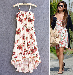 Q0013 田園復(fù)古風(fēng) 波西米亞 前短后長 吊帶連衣裙 中長款 兩色