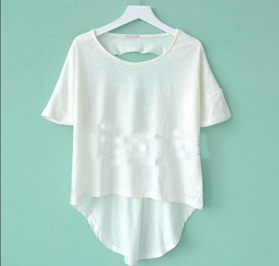 Q0022 2012韓版休閑時尚女裝鏤空褶皺圓領(lǐng)短袖不規(guī)則T恤 后背手工
