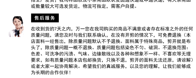 面料信息面料品名:水溶蕾絲面料貼花面料型號:E0333-7面料門幅:120CM面料材質(zhì):滌光絲面料特征厚度指數(shù):薄 常規(guī) 厚 柔軟指數(shù):硬 常規(guī) 柔軟 彈力指數(shù):無彈 適中 彈力