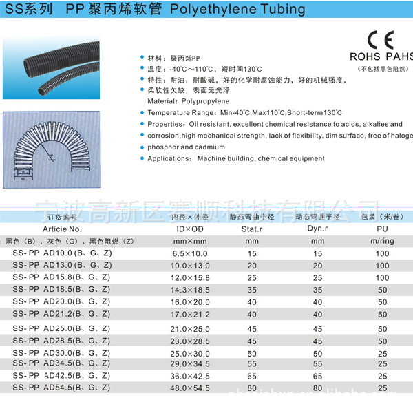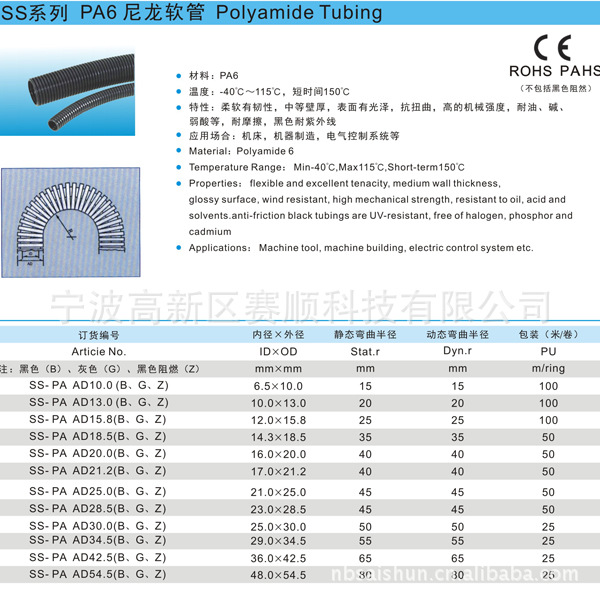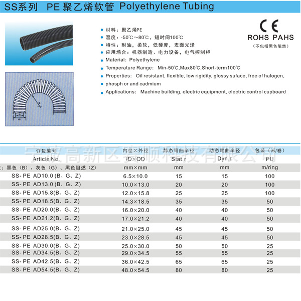 3)特性:柔軟有韌性,中等壁厚,表面有光澤,抗扭曲,高的機(jī)械強(qiáng)度,耐油、堿、弱酸等,耐摩擦,黑色耐紫外線(xiàn)等。