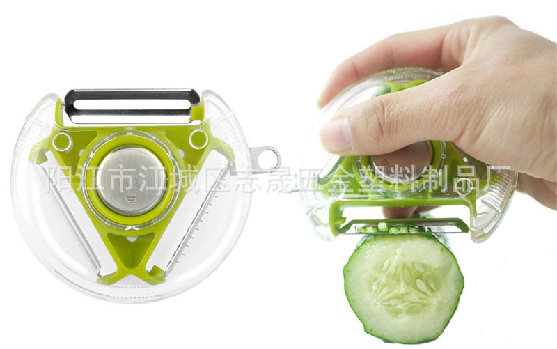 1,三合一多功能削皮器,廚房必備的瓜果去皮利器;三向旋轉(zhuǎn)刀片設(shè)計(jì),涵蓋常見(jiàn)瓜果刨皮功能。