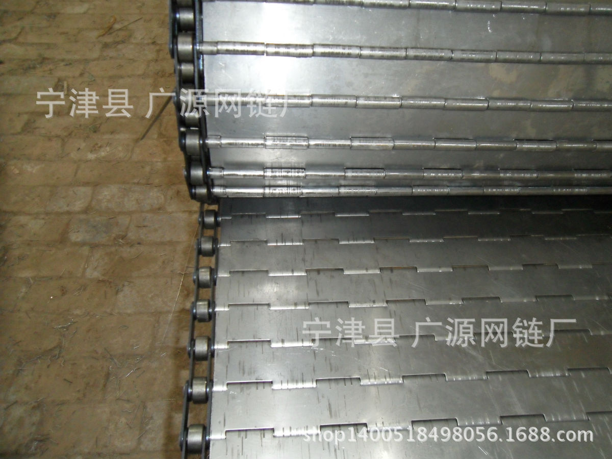 鏈板網(wǎng)帶非常堅(jiān)固,鏈條驅(qū)動(dòng),用于中等和大負(fù)荷輸送。鋼板彎曲形成合葉,使用支軸將合葉和鏈條串在一起。