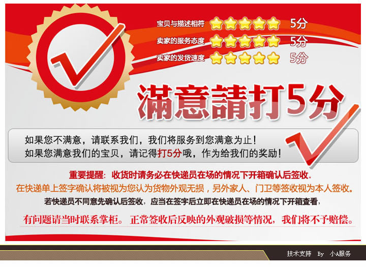 簽收時請務必當著運輸工作人員的面,打開包裹檢查商品有沒有損壞,核對數量是否正確,如果發(fā)現有問題一律拒簽,或是有問題一定當快遞員面聯(lián)系我們,待簽字之后,工作人員離開,發(fā)生的問題,買家承擔,為了有一個愉快的交易,請一定執(zhí)行!謝謝!一旦簽收則視為對商品已認可。