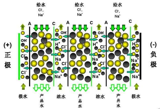 在EDI設(shè)備中,進(jìn)水中的各種離子通過(guò)樹(shù)脂后被脫除,水得到了純化,此時(shí)是利用離子交換原理來(lái)脫除水中的離子。由于離子交換膜兩邊加有電壓,水分子被電解為H 和OH-離子去再生樹(shù)脂,同時(shí)被H 和OH-離子交換下的離子在穩(wěn)壓穩(wěn)流電源的作用下,被遷移到濃水室排放,從而實(shí)現(xiàn)連續(xù)再生連續(xù)使用目的。
