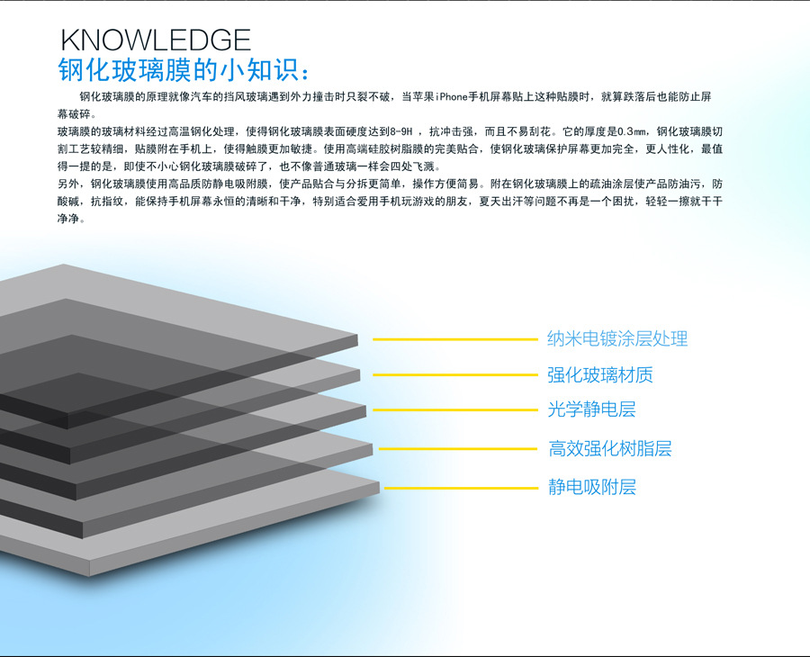 把一般的玻璃沉淀在硝酸鹽(KNO3)大幅度的增加了玻璃表面的密度同時(shí)也增加他的強(qiáng)度。密度的增加能提高的防刮能力。2012年在美國(guó)推出的鋼化玻璃保護(hù)膜,專為Iphone4/iPhone5 ipad 三星系列 而設(shè)計(jì)的高科技保護(hù)膜,是目前對(duì)Iphone屏幕強(qiáng)化保護(hù)的高端新產(chǎn)品。這種保護(hù)層的厚度只有0.5毫米,能將Iphone的屏幕面完全覆蓋,防止受到外力的損害,劃傷外,更增加了沖擊吸收性,比PET膜的標(biāo)準(zhǔn)高5倍。