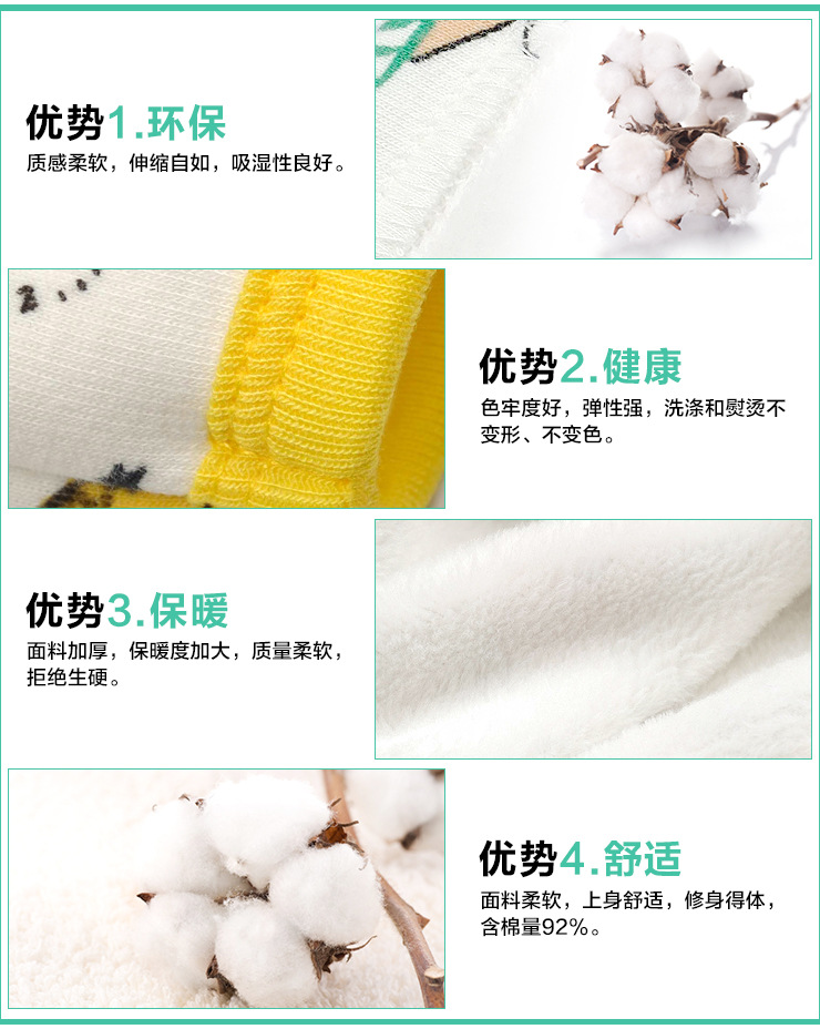 特點(diǎn):這款衣服,70碼的上衣是沒有開扣的,圓領(lǐng),因?yàn)?,4歲的寶寶已經(jīng)可以配合穿衣,不需要再開扣啦。