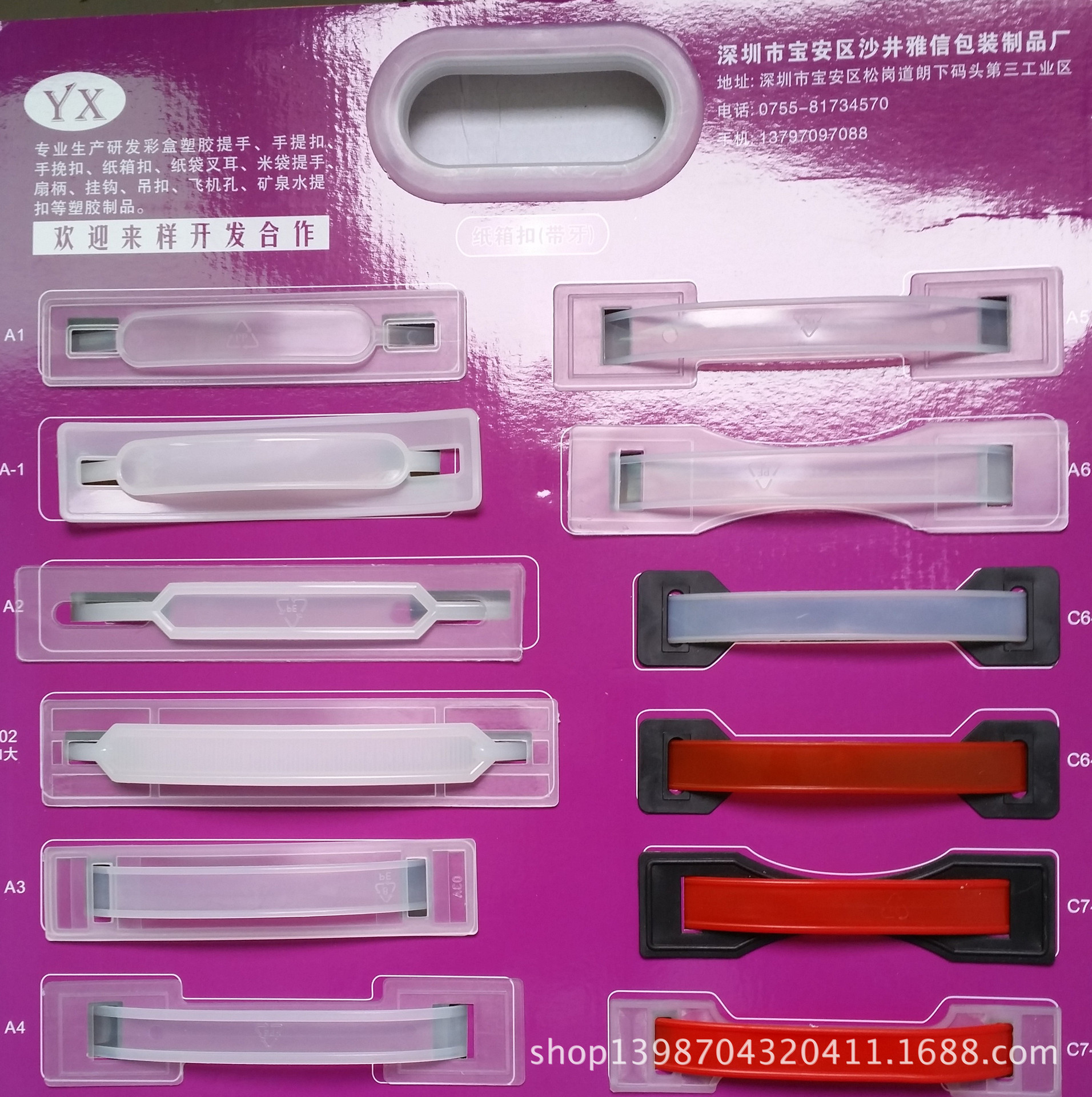 我公司專業(yè)生產(chǎn)銷售各種彩盒、彩箱、手提袋/米袋/面粉袋配套專用塑料提手,塑膠提手扣、手提扣、手挽扣、手提把、手挽帶、紙箱扣環(huán)/扣手、拎手,各式塑膠吊扣、掛鉤、紙袋手挽,米袋扣手,面粉袋扣手等產(chǎn)品多達八十多款;“質(zhì)量好,交貨快,價格平”同時承接樣板開發(fā)設(shè)計,加工等業(yè)務(wù);歡迎來電咨詢。除透明之外,量大可以定做其他顏色。