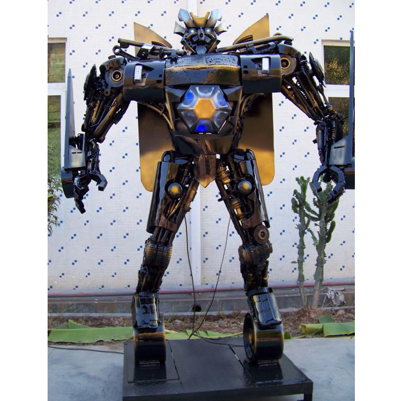 一代機(jī)甲戰(zhàn)士以家喻戶曉的變形金剛鋼雕為造型,采用環(huán)?;厥珍摬牡葹椴牧希蓪崿F(xiàn)身體七彩玄幻燈光效果,眼鏡會發(fā)光。