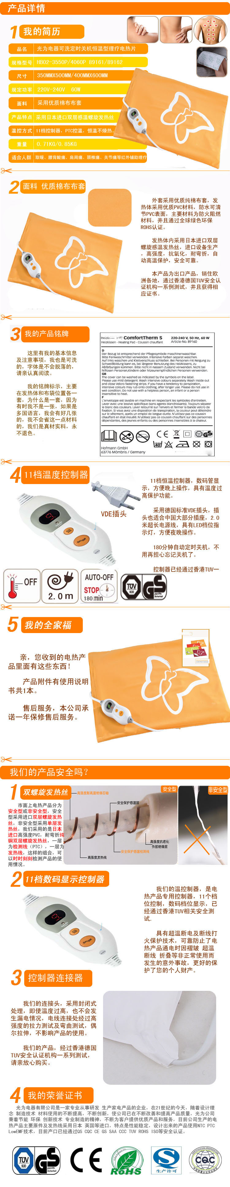 公司生產(chǎn)的主要產(chǎn)品有電熱毯,熱敷墊等。目前公司生產(chǎn)的電熱產(chǎn)品主要原件及發(fā)熱線采用日本及英國進(jìn)口。特點(diǎn)是性能穩(wěn)定,設(shè)計(jì)出來的產(chǎn)品使用NTC,PTC,LOWEMF技術(shù),使產(chǎn)品在安全特性方面走在行業(yè)前端。目前產(chǎn)品已通過CE,GS,SAA,TUV 等安全認(rèn)證。