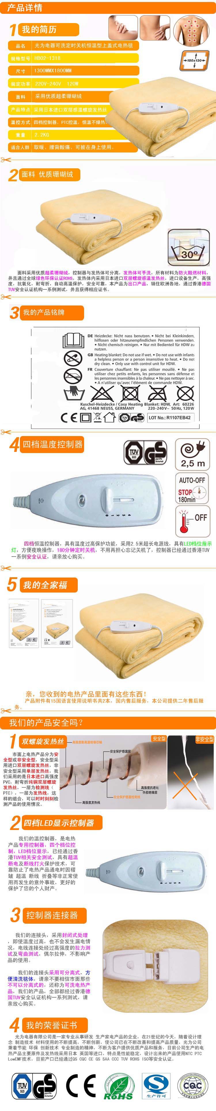公司生產(chǎn)的主要產(chǎn)品有電熱毯,熱敷墊等。目前公司生產(chǎn)的電熱產(chǎn)品主要原件及發(fā)熱線采用日本及英國進口。特點是性能穩(wěn)定,設(shè)計出來的產(chǎn)品使用NTC,PTC,LOWEMF技術(shù),使產(chǎn)品在安全特性方面走在行業(yè)前端。目前產(chǎn)品已通過CE,GS,SAA,TUV 等安全認證。