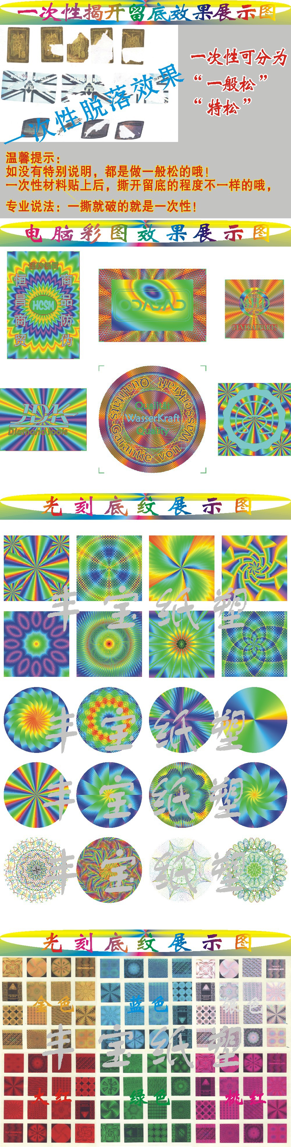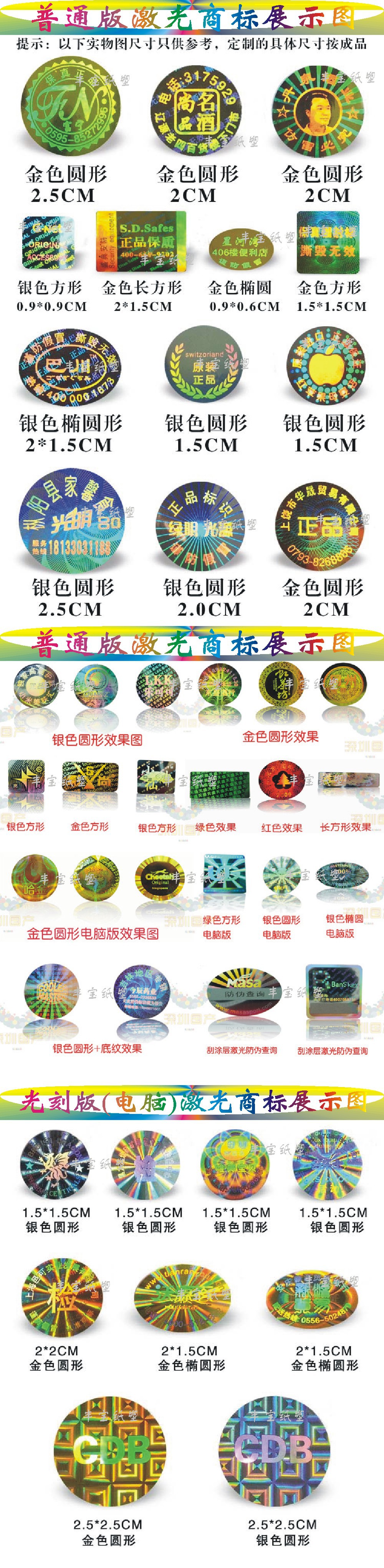 本廠專(zhuān)業(yè)制作激光防偽商標(biāo)、電碼防偽商標(biāo)、鏤空水洗防偽、不干膠印刷、螢光防對(duì)外承接激光制版、加溫變色、易碎紙商標(biāo)、特種防偽、PET/OPP鐳射膜、透明鐳射膜、絲網(wǎng)印刷、紙盒、包裝袋、無(wú)紡布袋、泡泡貼、紋身貼、專(zhuān)定定制等產(chǎn)品專(zhuān)業(yè)生產(chǎn)加工的公司,擁有完整、科學(xué)的質(zhì)量管理體系。蒼南縣龍港豐寶紙塑制品廠的誠(chéng)信、實(shí)力和產(chǎn)品質(zhì)量獲得業(yè)..