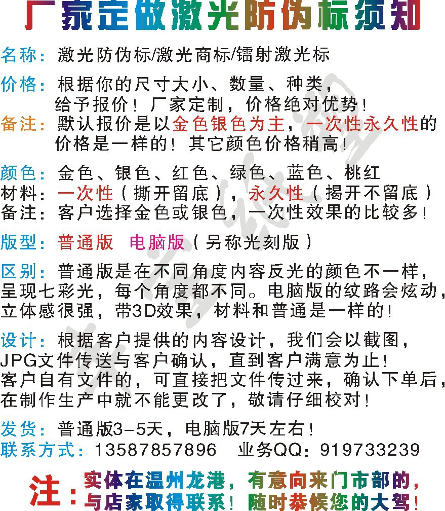 本廠專(zhuān)業(yè)制作激光防偽商標(biāo)、電碼防偽商標(biāo)、鏤空水洗防偽、不干膠印刷、螢光防對(duì)外承接激光制版、加溫變色、易碎紙商標(biāo)、特種防偽、PET/OPP鐳射膜、透明鐳射膜、專(zhuān)定定制等產(chǎn)品專(zhuān)業(yè)生產(chǎn)加工的公司,擁有完整、科學(xué)的質(zhì)量管理體系。蒼南縣龍港豐寶紙塑制品廠的誠(chéng)信、實(shí)力和產(chǎn)品質(zhì)量獲得業(yè)..