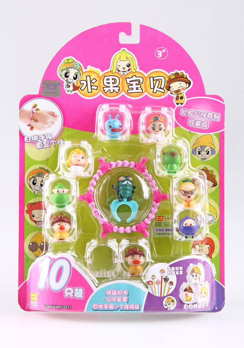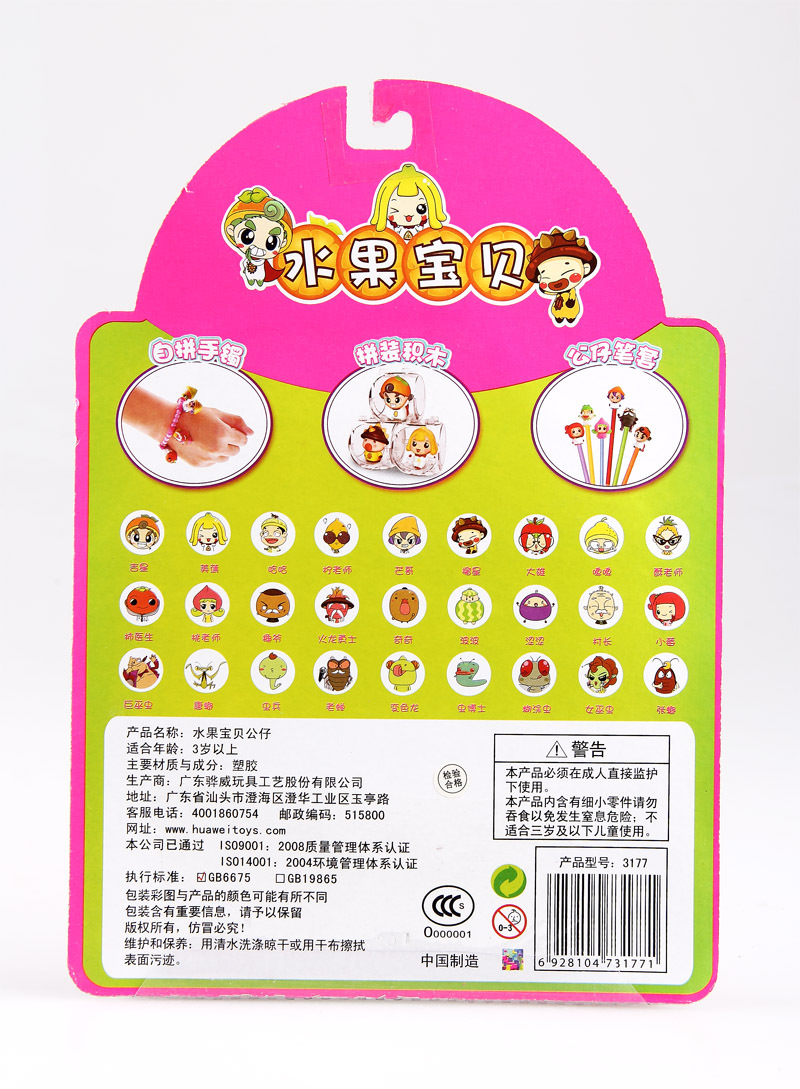 產(chǎn)品簡(jiǎn)介:本產(chǎn)品是動(dòng)畫(huà)片《水果寶貝》的衍生動(dòng)漫產(chǎn)品,組合了《水果寶貝》中36款形象公仔系列中的10款,配合積木型收藏盒,便于收藏精致的公仔,包裝中配有手鏈一條,手鏈?zhǔn)怯墒汁h(huán)圈和五角連桿兩部分組成,別致可愛(ài),顏色絢麗的迷爾公仔可裝配在五角星連桿上的圓形柱子上變成各種不同款式的公仔手鏈,功小朋友戴在手腕上。包裝中另配有一枚戒指,別致可愛(ài)、顏色多種絢麗,可以把顏色絢麗的迷爾公仔裝配在圓形柱子上變成不同款式的公仔戒指。另外《水果寶貝》形象公仔還可疊加在筆頭做裝飾,玩法多樣,趣味性強(qiáng)。