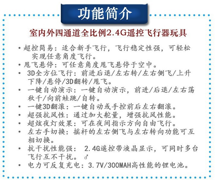 是一款具有創(chuàng)造性起飛模式的飛行器。采用程序,空中定位功能,可于任意角度隨意拋投飛行。另外還附有一鍵翻滾、一鍵自動(dòng)演示等特技功能;超控簡單、可玩性強(qiáng)、具備便攜性、競技性。