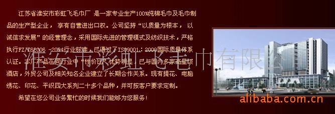 我廠是專門從事酒店毛巾四件套,浴袍,浴衣,毛毯,毛巾被等等巾類產(chǎn)品的生產(chǎn)與銷售。產(chǎn)品主要分為:平織,提花,繡花,割絨,色織,緞檔,提花,螺旋,螺旋提花等系列。