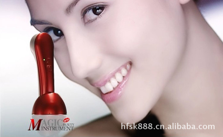 2.按下按鈕,使?jié)嵜嫫魈幱谡饎訝顟B(tài),將儀器輕柔放在臉上進行按[mo],避免觸及眼睛.(將2節(jié)五號電池放置儀器內(nèi),長時間不使用,可將電池取出)
